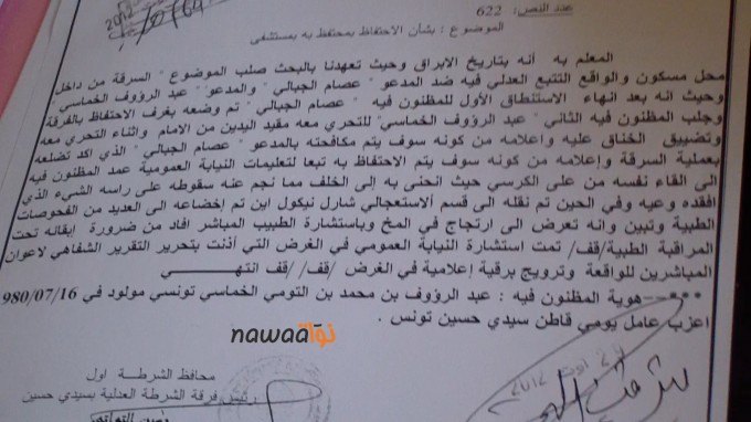 “مساء السبت 8 سبتمبر 2012 توفّي بمستشفى شارل نيكول المواطن عبد الرؤوف الخماسي من مواليد سنة 1972 الذي تم إيقافه يوم 28 أوت الماضي بمقر فرقة الشرطة العدلية بسيدي حسين على خلفية تتبع عدلي في قضية جنائية.