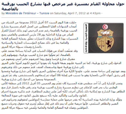 La décision du ministère d’empêcher la progression de cette manifestation -dont les organisateurs ont pourtant cherché à la déclarer aux autorités- viserait à assurer la circulation, à épargner aux commerçants les ennuis et à aider le tourisme néanmoins le résultat semble être tout autre. En effet, les médias occidentaux –que M.Ali Laraiedh estime beaucoup– n’ont pas manqué cette énième répression. Sur le Nouvel Observateur et selon l’AFP on peut lire :
