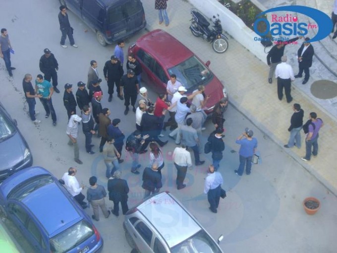 اثر ذلك قابلت السيد فيصل الناصر و هو عضو مكتب الاعلام بحركة النهضة وتم الحوار الصحفي في اجواء طيبة. وبمجرد مغادرتي لمكتبه و بالتحديد في بهو مقر حركة النهضة كانت هناك مشادة بين مراة و كانت تصيح بالمكان و كنت حاملا للكاميرا خاصتي فخيل اليهم على ما يبدو اني بصدد تصوير ما يحدث, ورغم انني كنت احما شارتي التي تحمل اسمي و اسم موقع نواة الا ان احدهم وهو من احد شباب الحركة الذي زاول تعليمه الجامعي معي في كلية العلوم القانونية و السياسية روج في صفوف الجميع اني “يساري كلب و بوليس متاع احد وجوه اليسار التونسي”.