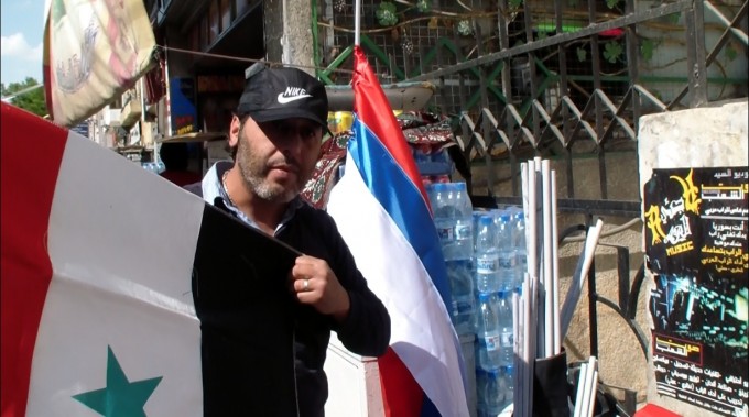 On sort du batiment du Conseil du Peuple. Sur le chemin, on tombe sur un vendeur qui s’avère être tunisien. Sur le trottoir, il étalait sa marchandise. Il vend des drapeaux syriens et russes, des pin’s et des t-shirts avec l’effigie de Bachar Al Assad.