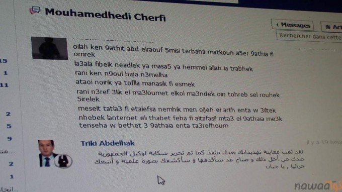 بعد الحوار الذي دار بيني و بين السيد خالد طرّوش على موجات إذاعة إكسبرس إف إم و بعد تصريحاته ذات النبرة التهديديّة و بعد أن تهرّب خلال مداخلته بشكل واضح من الحديث عن ملف ضحيّة التعذيب عبد الرؤوف الخمّاسي، يبدو أنّ عدوى إستعراض العضلات إنتشرت إلى حدّ الوصول إلى مُحامي ضحيّة التعذيب عبد الرؤوف الخمّاسي و هو الأستاذ عبد الحقّ التريكي حيث تلقّى ليلة 3 أكتوبر 2012 تهديدا صريحا بقتله هو و عائلته على صندوق مراسلاته الخاصّ بحسابه على شبكة فايسبوك.