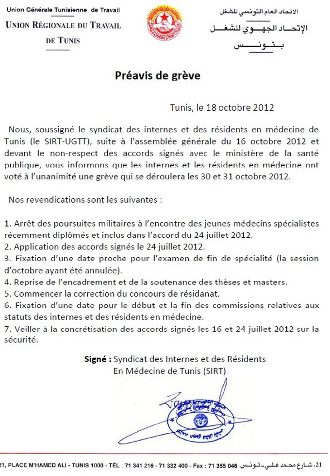 Le syndicat des internes et résidents en médecine de Tunis a décidé à l’unanimité une grève qui se déroulera le 30 et 31 octobre 2012.