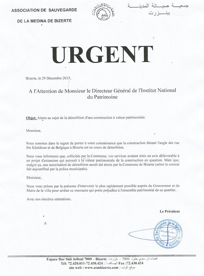 La chronique de cette barbarie remonte au mois d’août 2015. Le propriétaire, qui exploite le bâtiment comme centre de formation, avait déposé un dossier de permis de bâtir pour réaliser une extension de deux étages. Le fait que tout l’ilot abritant l’édifice est classé comme « monument à intérêt architectural » au Plan d’Aménagement Urbain (P.A.U) de la ville de Bizerte (approuvé le 31 juillet 2009), a obligé la Commune à consulter l’Institut National du Patrimoine (I.N.P). L’avis de ce dernier a été clair : un refus catégorique de la version (de l’extension) proposée et des consignes pour guider les maîtres de l’œuvre et maîtres de l’ouvrage dans une extension où l’authenticité de l’édifice serait sauvegardée au mieux.