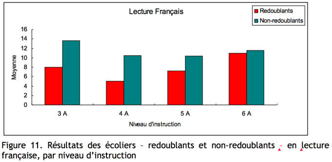 Pour mieux présenter les résultats, nous avons opté pour l’illustration des moyennes des écoliers redoublants et non-redoublants, afin de montrer les écarts des moyennes entre les deux groupes.
