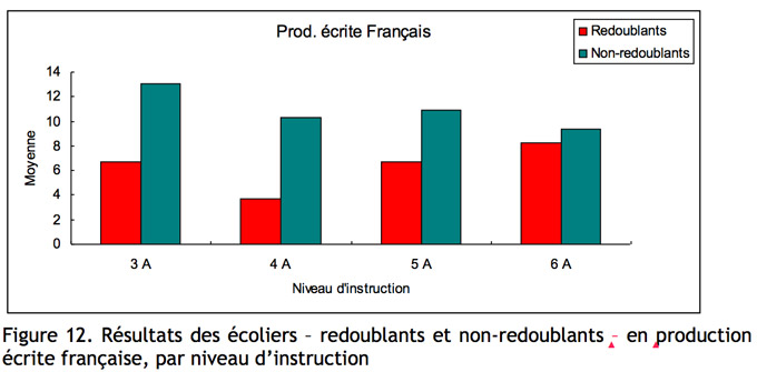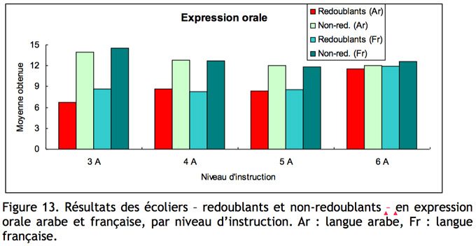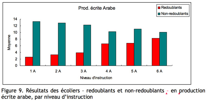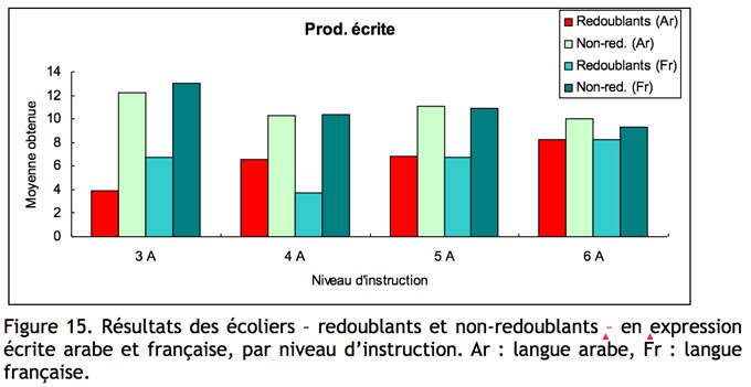 Important à souligner encore : le fait que les différences de moyennes entre redoublants et non-redoublants sont les plus accentuées en production écrite en français par rapport aux deux autres matières (expression orale et lecture). La faiblesse de nos écoliers en production écrite en français se dégage dès la seconde année d’étude de cette langue, simplement parce que leurs moyennes (pour les non-redoublants) ne sont pas aussi élevées (10,34 en quatrième et 10,89 en cinquième année) qu’au cours de la première année d’études du français (13,07) ou aussi par rapport aux autres matières enseignées en langue arabe.