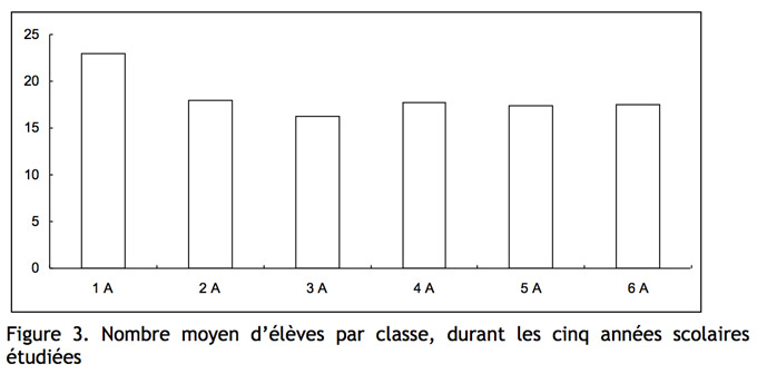 La figure 3 montre le nombre moyen d’élèves par classe durant les cinq années scolaires étudiées. Ce nombre varie de 16,2 à 23 élèves par classe. Le nombre maximal enregistré était de 30 élèves par classe, et le nombre minimal de 13 élèves.