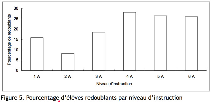 Par rapport à l’ensemble des années et des niveaux d’instruction, le pourcentage d’élèves redoublants est représentés par la figure 5. Ce taux varie entre 8, 33 % (2ème année, n = 108) et 28,23 % (4ème année, n = 124). Il est globalement de 21, 46 % pour l’ensemble des écoliers durant les cinq années étudiées (n = 783). Il est intéressant de remarquer que les taux de redoublement dans les deux derniers niveaux d’instruction du cycle d’études primaires sont plus faibles que ceux de la quatrième année, et que le taux de redoublants en 5ème année est légèrement plus élevé que celui enregistré en 6ème année (respectivement 26,44 et 25,95 %). On constate tout simplement que le taux de redoublement s’accroît nettement entre les trois premières et les trois dernières années du cycle d’études primaires.
