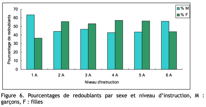 La figure 6 montre la variation du pourcentage de redoublants par niveau d’instruction et sexe des écoliers. On constate que ce taux varie, chez les filles, de 36,36 % en 1ère année à 57,14 % en 4ème année, alors que chez les garçons, il varie de 42,86 % à 63,64 %, respectivement en 4ème année et en 1ère année. Le taux de redoublement des filles n’est inférieur à celui des garçons qu’en 1ère et 6ème années. Globalement, le pourcentage de filles redoublantes est légèrement supérieur à celui des garçons (50,6 %). Autrement dit, les disparités constatées entre les deux sexes des élèves sont variables d’un niveau à un autre et la probabilité de redoublement est sensiblement la même pour chacun d’eux.