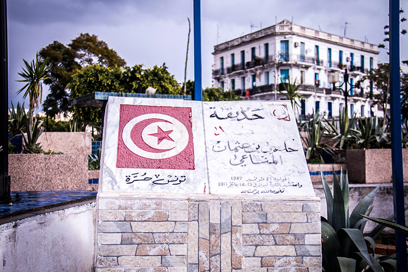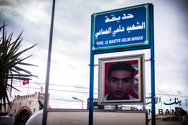 A Bab el Khadra, l’écriteau qui indique le nouveau nom du jardin imite du mieux qu’il peut le style habituel des municipalités. Mais il n’est pas difficile de deviner qu’il n’est pas officiel, quelques petites fautes, un coin qui se décolle, tout autant d’indices pour comprendre que ce n’est pas une initiative de l’Etat tunisien rendant hommage à la mémoire d’une de ses victimes. L’initiative a été portée dès 2011 par des habitants de Bab el Khadra et de Lafayette, sotenus par le bureau local du Conseil de Protection de la Révolution.