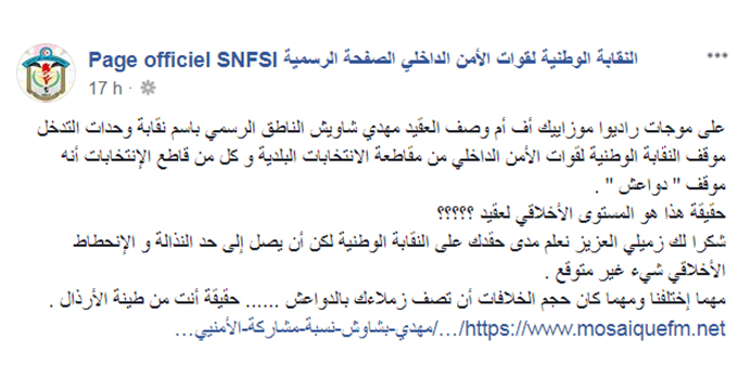 من جهته أسَّسَ الاتحاد الوطني لنقابات قوات الأمن التونسي موقف المشاركة في الانتخابات البلدية على نفس الشعار “الأمن الجمهوري”، وفي هذا السياق قال عماد الحاج خليفة الأمين العام للاتحاد “نريد بناء أمن ديمقراطي وجمهوري، فنحن ندفع الضرائب وسنختار من سيُمثلنا في المجالس البلدية لنعرف لمن ندفع هذه الضرائب”. ويلوح أن هذا الموقف يدفع أيضا نحو تأثير الأسلاك الأمنية في الحياة السياسية عبر صناديق الاقتراع التي ستشكل إطارا جديدا للضغط على الأحزاب من أجل تحقيق مطالب الأمنيين، وهو ما عبّر عنه عماد الحاج خليفة بالقول “سننتخب من نراه كفء لإدارة الشؤون اليومية للأمنيين”. من جهة أخرى يرتبط موقف المقاطعة الانتخابية بالضغط على مضامين التشريعات المتعلقة بالشّأن الأمني، حيث أشار شكري حمادة، الناطق الرسمي باسم النقابة الوطنية لقوات الأمن الداخلي، إلى أن “المشرّع يعطي حقوقا مبتورة للأمنيين”، مذكّرا بالاستياء الأمني من المعارضة البرلمانية التي جُوبِهَ بها قانون زجر الاعتداء على القوات الحاملة للسلاح. ويُذكر أن هذا القانون لقي معارضة حقوقية وإعلامية وسياسية واسعة، في حين اتحدت في الدفاع عنه جل النقابات الأمنية.