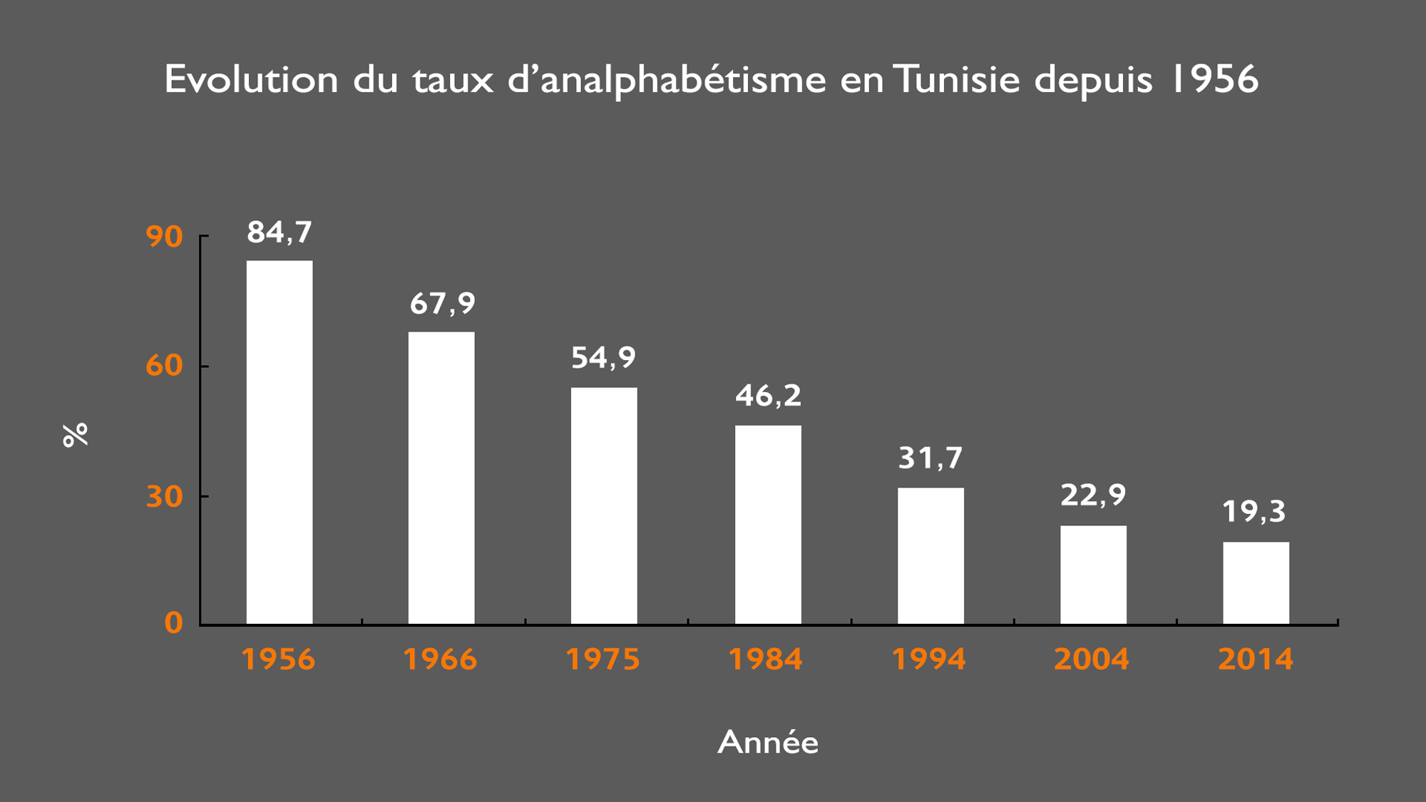 Selon ce rapport, le taux d’analphabétisme est de 19,3 % pour l’ensemble de la Tunisie. Il n’a cessé de diminuer au fil du temps depuis 1956 (figure 1)[1], ce qui souligne les efforts consentis pour réduire ce taux. Deux constantes demeurent : les analphabètes sont plus nombreux parmi les femmes que les hommes et les ruraux que les citadins.