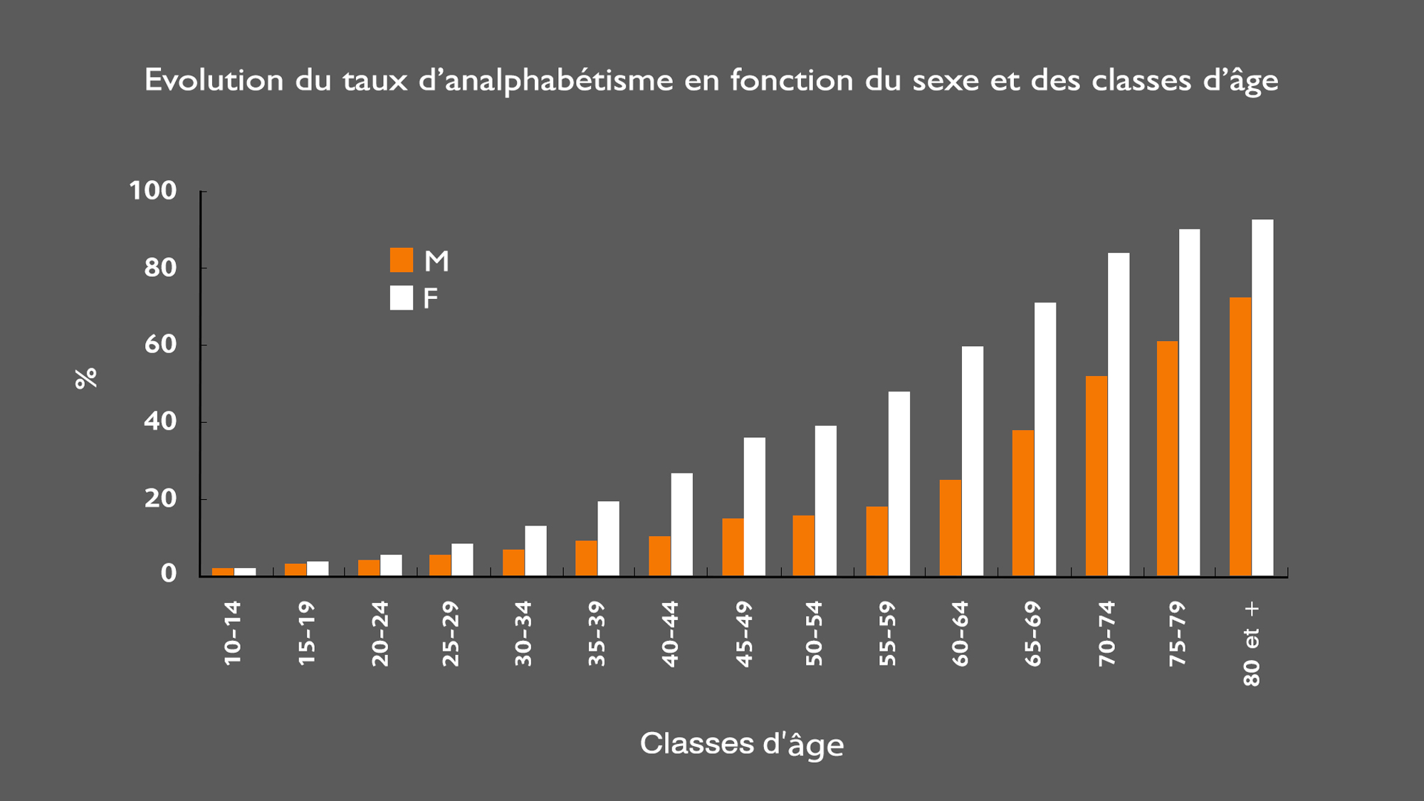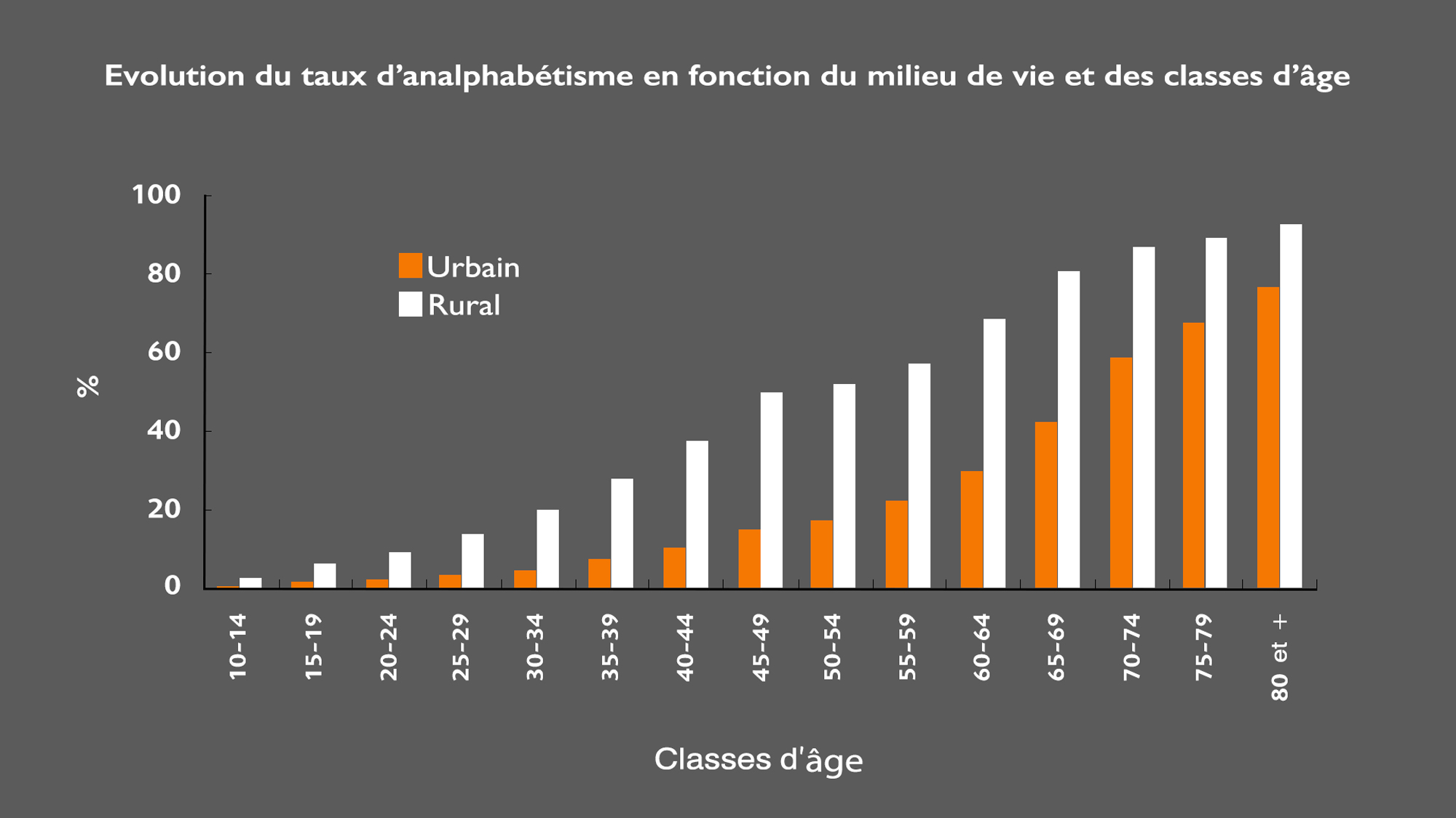 On est donc mal parti dans la vie lorsqu’on est né fille en milieu rural. Actuellement (2014), le taux d’analphabétisme des femmes en milieu rural est deux fois et demi supérieur en milieu rural qu’en milieu urbain (17,9 vs 41,7 %). Ces proportions sont plus élevées chez les hommes (près de trois fois ; 23,1 vs 8 %). Globalement, le taux d’analphabétisme des femmes est pratiquement le double de celui des hommes (25,6 vs 12,8 %).