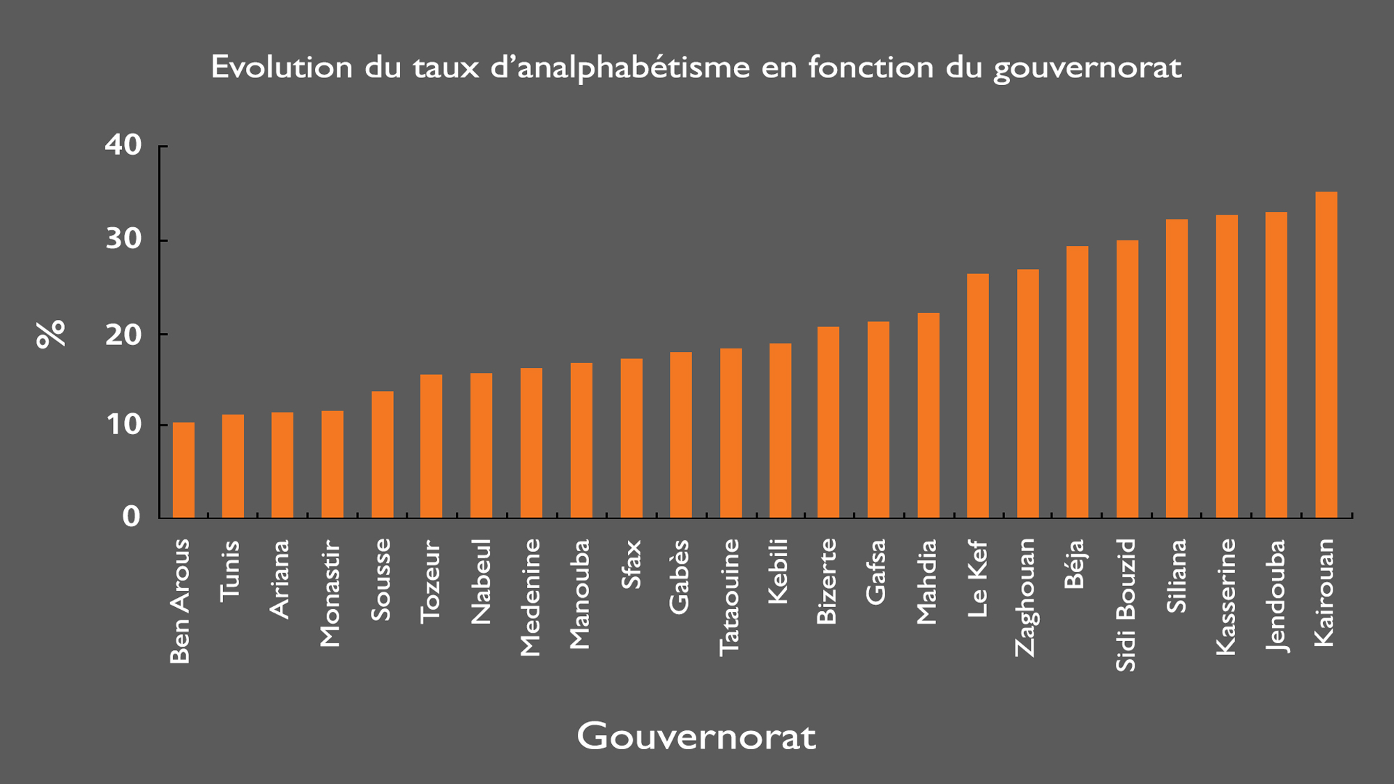 Le taux d’analphabétisme présente des disparités spatiales (figure 4). En effet, les gouvernorats du centre-ouest et du nord-ouest sont les plus fragilisés par l’analphabétisme ; le record étant détenu par le gouvernorat de Kairouan (35 %). Les gouvernorats de Bizerte, Mahdia et Zaghouan se situent en dehors de leurs régions respectives, avec des taux allant de 20,5 à 26,9 %.