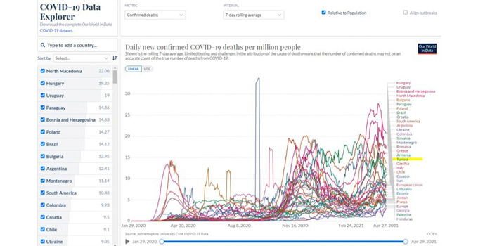 Intervenu le 29 avril sur les ondes de Mosaïque Fm, le membre de la Commission scientifique de lutte contre le coronavirus, le docteur Riadh Gouider a affirmé que la Tunisie est la première dans le monde en nombre de décès causés par le Covid-19. «La Tunisie est première en nombre de tests positifs enregistrés quotidiennement et de morts», a-t-il alerté. Cette déclaration a été reprise par plusieurs médias (ici et ici).