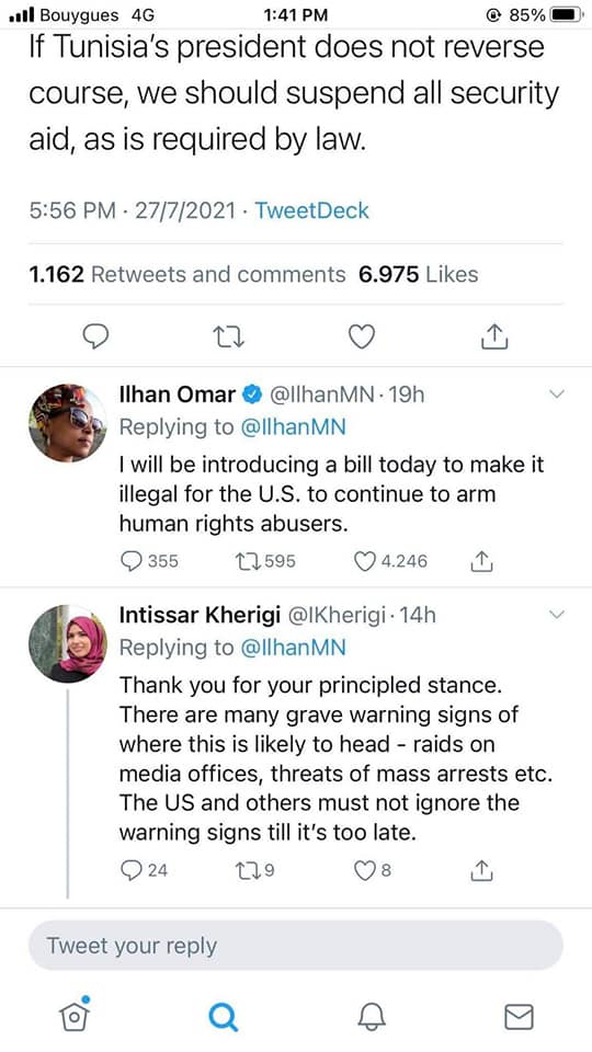 Coté parlementaires, la représentante démocrate Ilhan Omar a appelé l’administration américaine à arrêter l’aide sécuritaire à la Tunisie. Elle a également annoncé son intention de déposer une proposition de loi rendant illégale toute coopération militaire avec les pays qui violent les droits humains. Elle a reçu le soutien d’Intissar Kheriji. Coté républicain, le sénateur Joe Wilson appelle aussi à une réaction plus musclée.