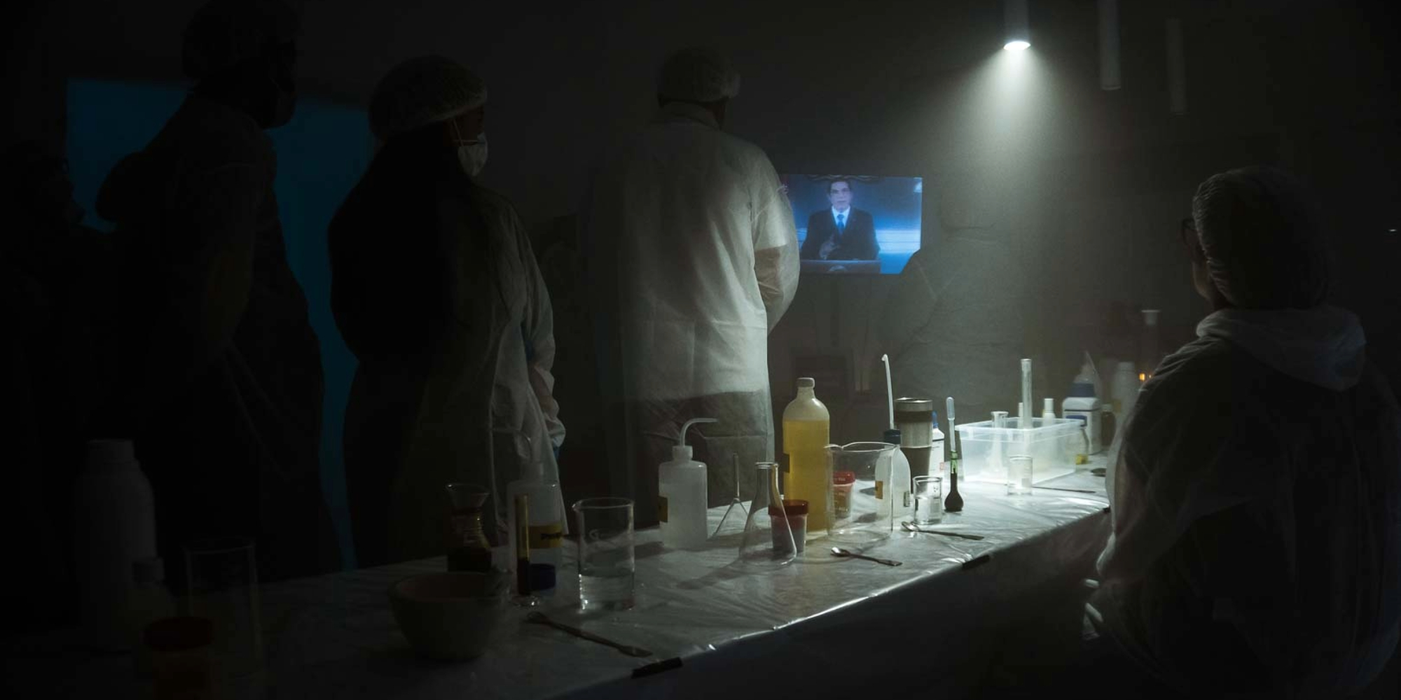 خلال العرض يقطع رنين هاتف من السبعينات تركيزك ليلفت نظرك إلى نقاط مهمة تنتظرك في العرض وينبهك إلى تواصل المفاجآت، قبل ان يواجهك الجدول الدوري للعناصر الكيميائية وقد تحولت حروف مكوناته العلمية المعروفة إلى أسماء رموز من النضال الوطني التقدمي وشهداء تونس في فلسطين المحتلة إضافة إلى اسامي الثوار والمبدعين وأصحاب الفكر المستنير الحر من كل العالم.