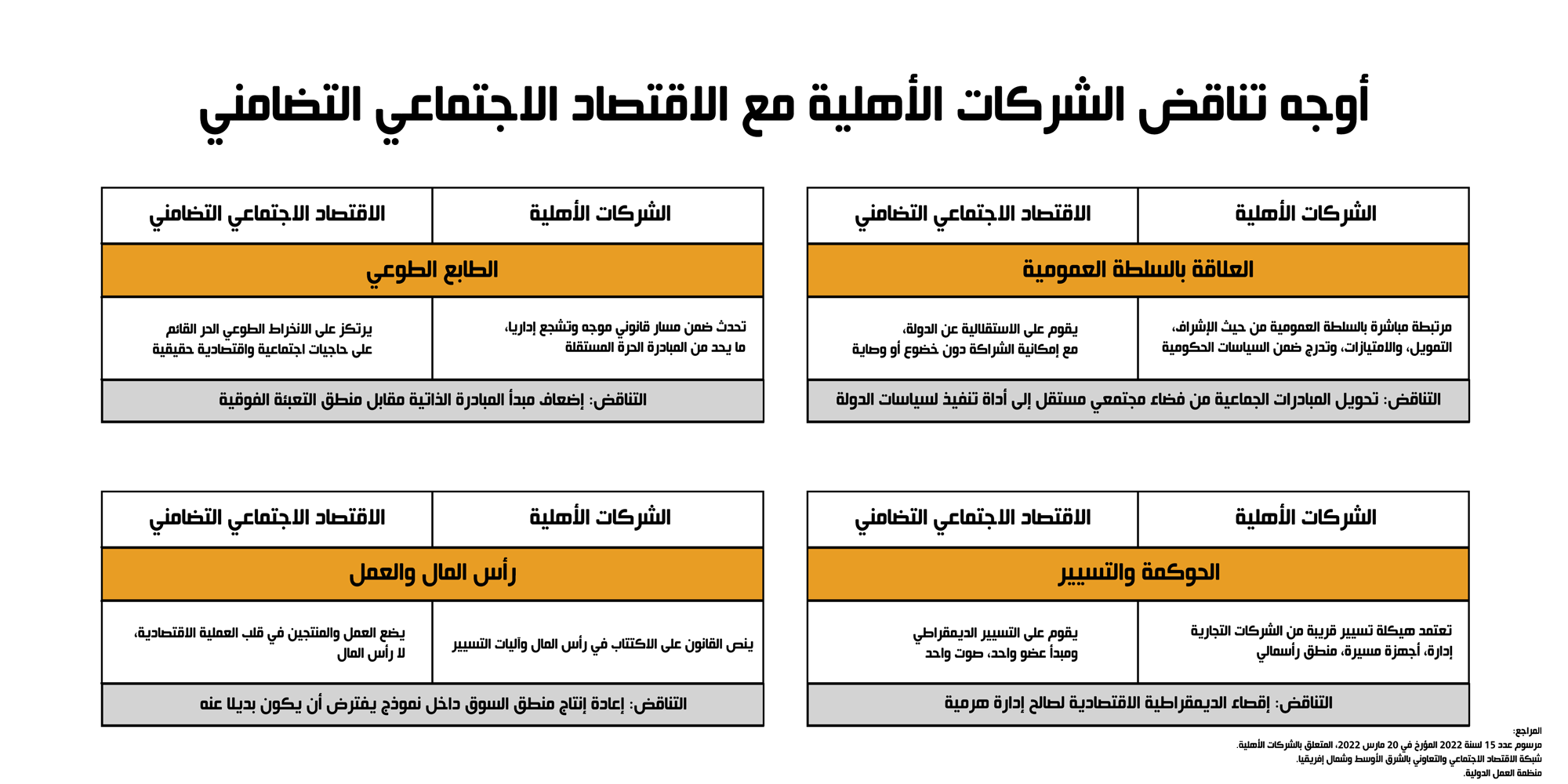 تُعرف شبكة الاقتصاد الاجتماعي والتعاوني بالشرق الأوسط وشمال إفريقيا، الاقتصاد الاجتماعي والتعاوني بأنه نمط اقتصادي يقوم على تمكين الشعوب من ابتداع أدوات إدارية للاقتصاد تمكنها من إدارة مواردها وتحقيق أهدافها وتطلعاتها بالتوافق التام مع بيئتها الطبيعية وتاريخها الثقافي والاجتماعي.