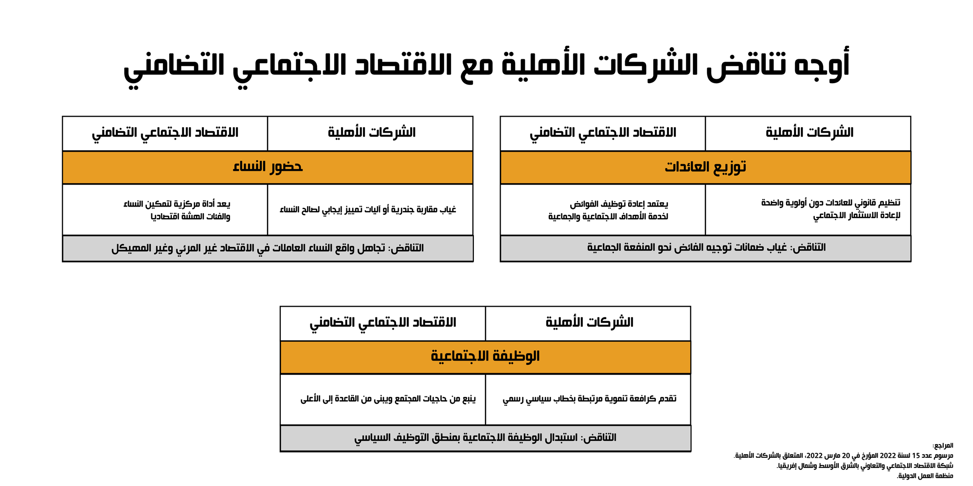 قانون الاقتصاد الاجتماعي والتضامني، حتى وإن طرح بعض هذه الإشكاليات، لم يحدّد الآليات الكفيلة بتطوير فكرة التعاون ولا بإخراج النساء من وضعية العمل غير المُهيكل، بل تم، في المقابل، ”السطو“ على هياكل كانت تحمل بعض خصائص الاقتصاد الاجتماعي والتضامني، وإعادة تدويرها دون تحقيق فائدة حقيقية للفئات المعنية.