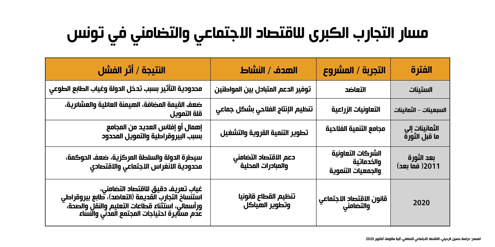 ويضع الرحيلي هذا الفشل ضمن سياق أوسع من تكرار التجارب ذاتها في الاقتصاد الاجتماعي والتضامني بتونس، حيث لا تزال البلاد، منذ الستينات، تعيد استنساخ نفس الأشكال المرتبطة بتجربة التعاضد، التي انحصرت أساسًا في المجال الفلاحي الريفي، ثم التعاونيات ومجامع التنمية الفلاحية، وصولًا إلى الشركات الأهلية اليوم، دون توسيع مجالات التدخل نحو الصناعة أو البيئة أو تحويل المواد الفلاحية، ويستدعي في هذا السياق الإشارة إلى تجربة التعاضد في الستينات كمرجع تاريخي تأسيسي، انتهى هو الآخر إلى الفشل بسبب تدخل الدولة وغياب الطابع الطوعي والاستقلالي.