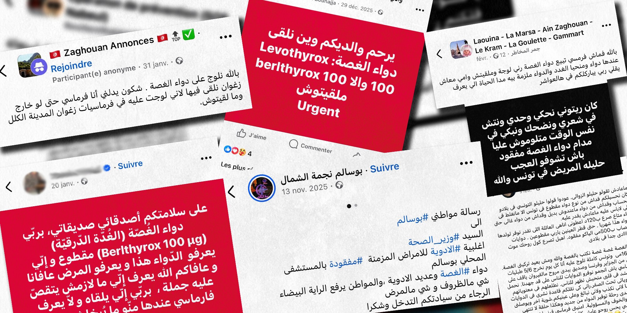 معاناة ليلى ليست حالة فردية أو معزولة بقدر ماهي صورة مصغّرة لأزمة أوسع تضرب النساء في مختلف أنحاء البلاد. هذا الواقع الصعب قادنا خلال فترة بحثنا، وعلى امتداد بضعة أشهر، إلى مئات التدوينات والنداءات التي نشرتها نساء من ولايات ومناطق متعددة، بحثا عن دواء الغدة الدرقية المعروف في التداول اليومي باسم ”دواء الغُصّة“. في الفضاء الرقمي تتحوّل الصفحات والمجموعات إلى منصات استغاثة جماعية حيث تتكرر العبارات نفسها بصيغ موجعة ”الدواء مقطوع“ ”امرأة في حاجة مستعجلة“ ”الحالة الصحية تتدهور“، نداءات قصيرة ومباشرة لكنها تكشف حجم القلق والخوف الذي يرافق الانقطاع القسري عن علاج حيوي لا يمكن تعويضه فيفضح هذا السيل من الشهادات العفوية واقعا تعيشه النساء أساسا، باعتبارهن الأكثر عرضة لأمراض الغدة الدرقية، ويكشف كيف دفعت الأزمة الدوائية بالمواطنات إلى البحث عن حلول فردية في فضاء عام بدل اللجوء إلى مؤسسات الدولة التي يفترض أن تضمن هذا الحق دون وساطة أو استغاثة، وتزداد المفارقة حدّة إذا ما قورن هذا الواقع بما أعلنته الصيدلية المركزية التونسية في بيان رسمي لها خلال شهر سبتمبر الفارط مؤكدة توفر دواء الغدة الدرقية، هذا البيان بدا في ضوء ما وثقناه شكليا ومنفصلا عن الواقع إذ لم ينعكس على رفوف الصيدليات ولا على يوميات النساء اللواتي واصلن نشر نداءاتهن بحثا عن علبة دواء مفقودة. وبين خطاب رسمي وواقع اجتماعي يعجّ بالاستغاثات والانتظار والقلق تتسع الفجوة بين الدولة ومواطنيها وتتحوّل علبة دواء إلى رمز لأزمة أعمق تتمثل في أزمة منظومة صحية عاجزة عن القيام بدورها.