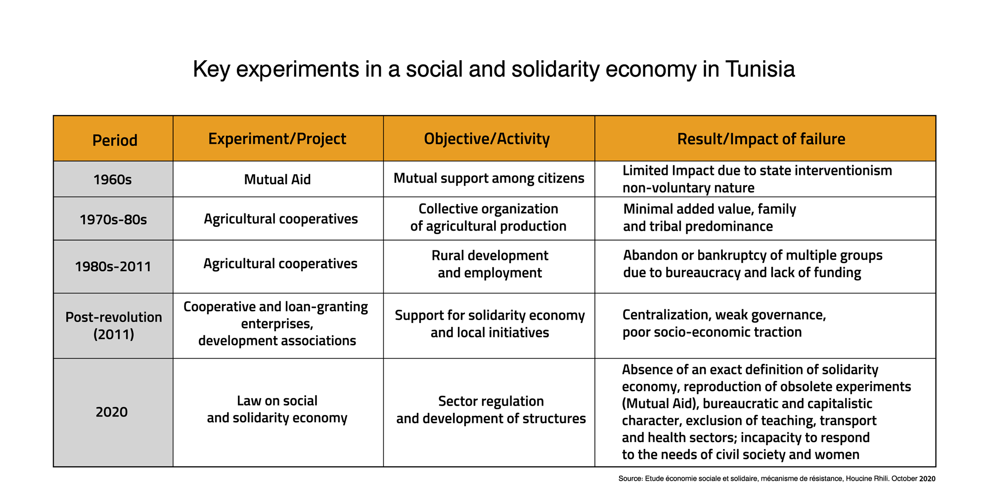 Rhili frames this failure within a broader trend in Tunisia, where the same experiments in solidarity economy have been reproduced over the years. Indeed, since the 1960s, the country has recreated the same types of structures associated with the early cooperatives which operated in the sector of rural agriculture, then those which worked in agricultural development, and finally, today, the formula of community-based enterprises, without ever expanding into the sectors of industry, environment or the transformation of agricultural products. As a historical reference, Rhili points to the experiment of cooperatives in the 1960s which also ended in failure due to state interventionism and a model which was neither voluntary nor independent.
