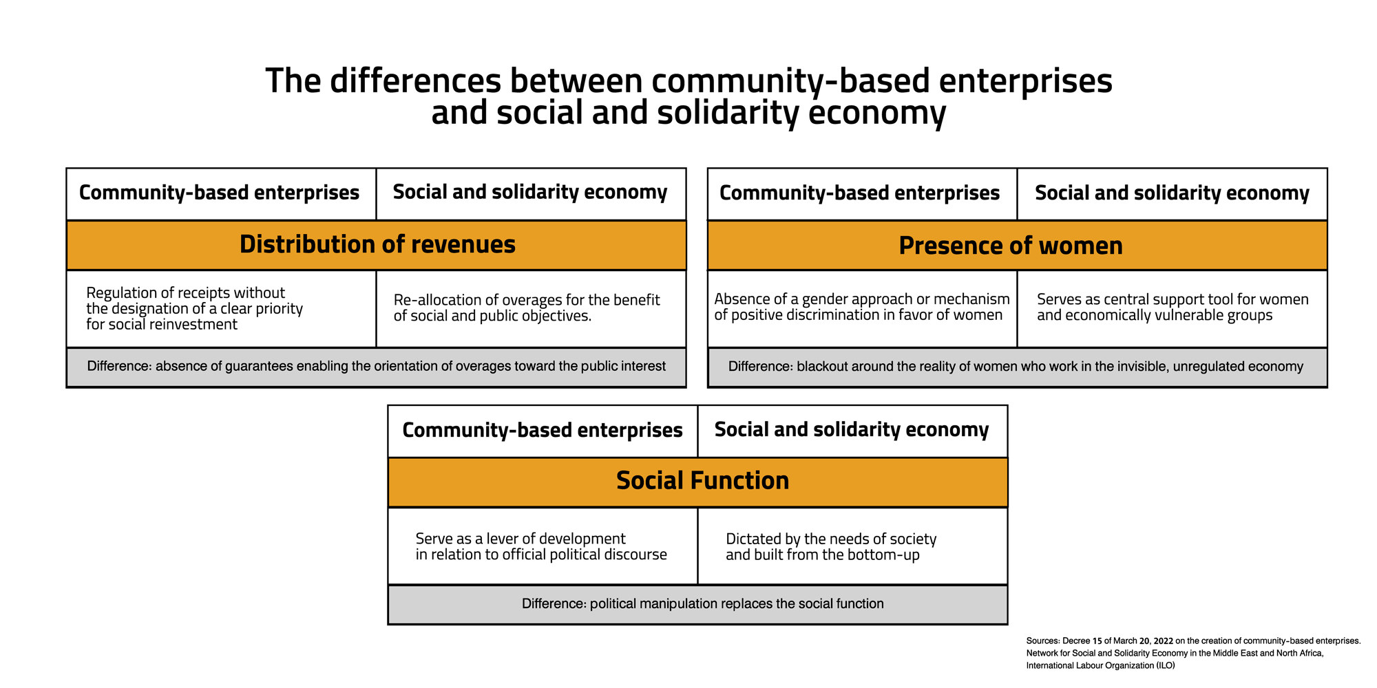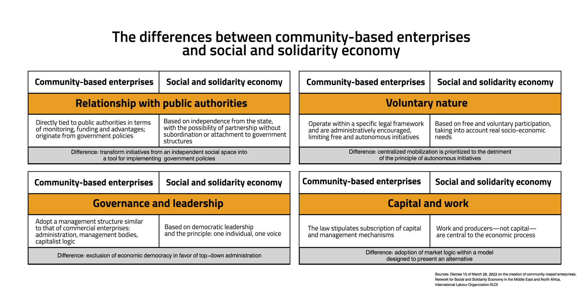 For Lyla Riahi, community-based enterprises represent a model that is easy to manipulate for the purposes of political cronyism. She explains that the law regulating these structures neither defines their work nor their resources, and does not place them at the heart of the production process, but only mentions subscription of capital and management mechanisms. She adds that the system of governance within these enterprises is undemocratic and inaccessible to workers and producers. As a result, this model is a far cry from the universally-recognized framework of cooperative movements, which are based on collective control of production, autonomy and effective participation in the decision-making process. Riahi concludes that this model does not respond to conditions for organizing work and does not create real pathways towards emancipation for women who work in the informal economy; it neither enables them to overcome their vulnerability nor to collectively appropriate their own means of production.