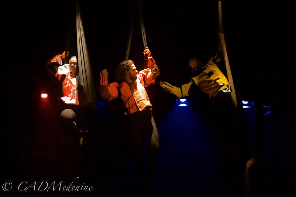 The use of multiple techniques is also a theme of the festival. “Nowadays theatre and art are more and more performed in the streets. What we do is to try to bring the streets inside the theatre.” The festival’s opening show, by Mr. Ali’s colleague Anouar Chaafi, takes this direction. Aw la takoun is a play based on the couples of four Shakespearian tragedies—Romeo and Juliette, King Lear, Othello, and Hamlet—which focuses on racial and women’s issues. But the real innovation of the piece is the scenic design: the actors move up and down the stage using the circus technique of aerial tissues.