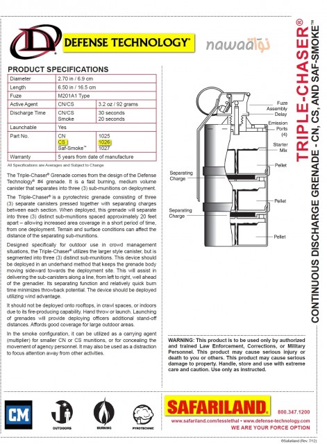 En essayant de remonter jusqu’à la compagnie qui fabrique le produit on se rend compte que la Triple chaser grenade est aujourd’hui fabriquée par Defense Technology, sous l’identifiant 1026, qui a supplanté l’identifiant 515 qu’utilisait Federal Laboratories. Une grenade dont voici la fiche technique.